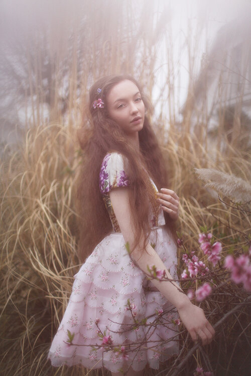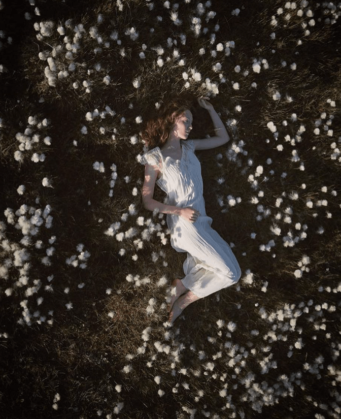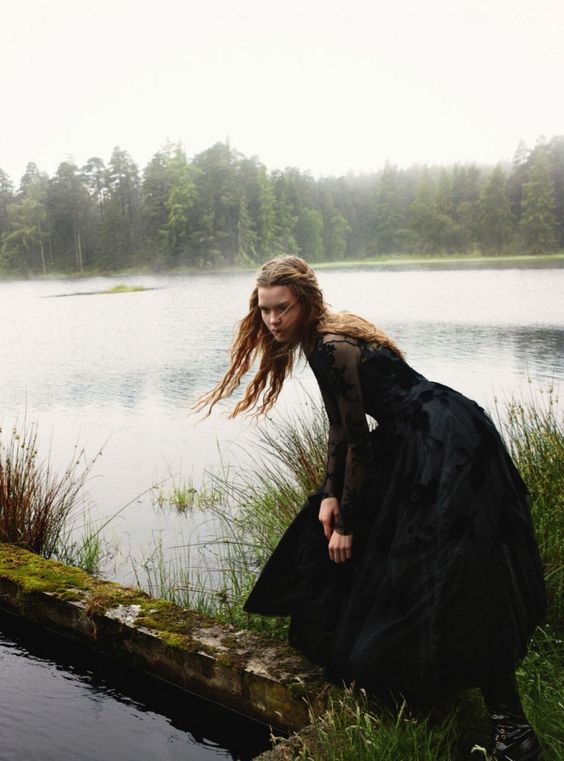 Usually she can be found in a plain white dress, hair loose with some braiding at the crown, and often flowers or other fauna threaded through, including twigs and berries.